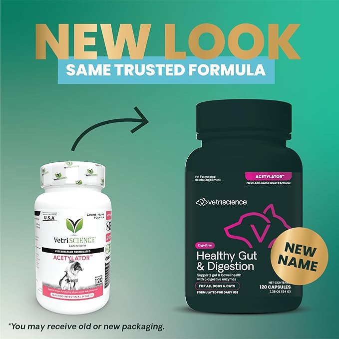 VetriScience Healthy Gut & Digestion Easy-Open Capsules, Acetylator Digestive Enzyme Supplement for Dogs and Cats, Probiotics and Enzymes, Soothe Gut and Bowel Discomfort, 120 Count
