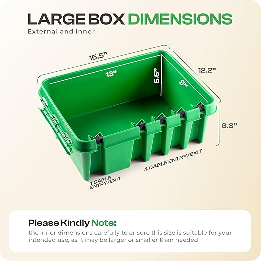 - LARGE OUTDOOR ELECTRICAL BOX WATERPROOF PROTECTION – The SockitBox Green Large is built to keep large outdoor electrical connections safe and dry. This outdoor electrical box waterproof solution is perfect for protecting devices in all weather conditions, including rain, snow, and dust.
