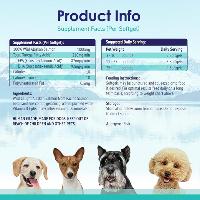 Pure Wild Alaskan Salmon Oil for Dogs, Omega 3 Fish Oil Supplement for Healthy Skin & Shiny Coat, Prevents Itchy Skin, Skin Allergies & Shedding, 120 Soft Capsules