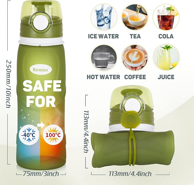 - WIDE TEMPERATURE: Endures a wide range of temperatures from -40℃ to 100℃; use with refrigerated or boiled liquids; crash proof and anti-collision design makes collapsible water bottle a perfect companion for bicycling, running, swimming, outdoor activities, extreme sports, and more