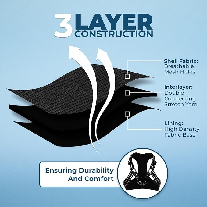 - REFLECTIVE WEBBING: 3M Scotchlite reflective material on the straps of this dog harness enhance your dog’s visibility during those early morning and late evening strolls.