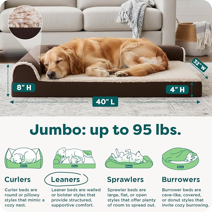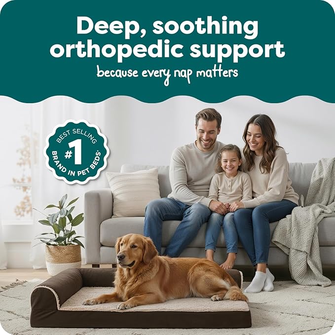 FurHaven Orthopedic Dog Bed for Large Dogs, L-Shaped Chaise Contour Mattress with Egg Crate Orthopedic Memory Foam for Joint Support, Removable Washable Cover, Jumbo/XL, Faux Fur & Suede, Espresso