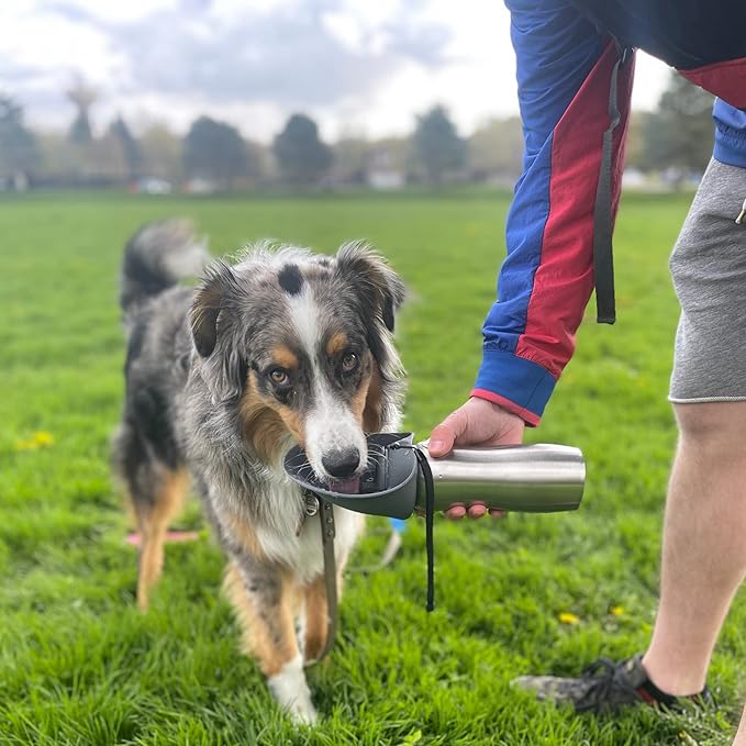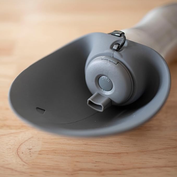 - PORTABLE PET ACCESSORY –The extra wide silicone drinking bowl flips up for easy serving. Easily pour water out with the water release on/off button. The water will self-level in the bowl and continue to fill as your dog slurps away. Most of the unused water drains back into the stainless-steel bottle after use to reduce waste. Simply tip it back before folding the bowl back over into its portable position.