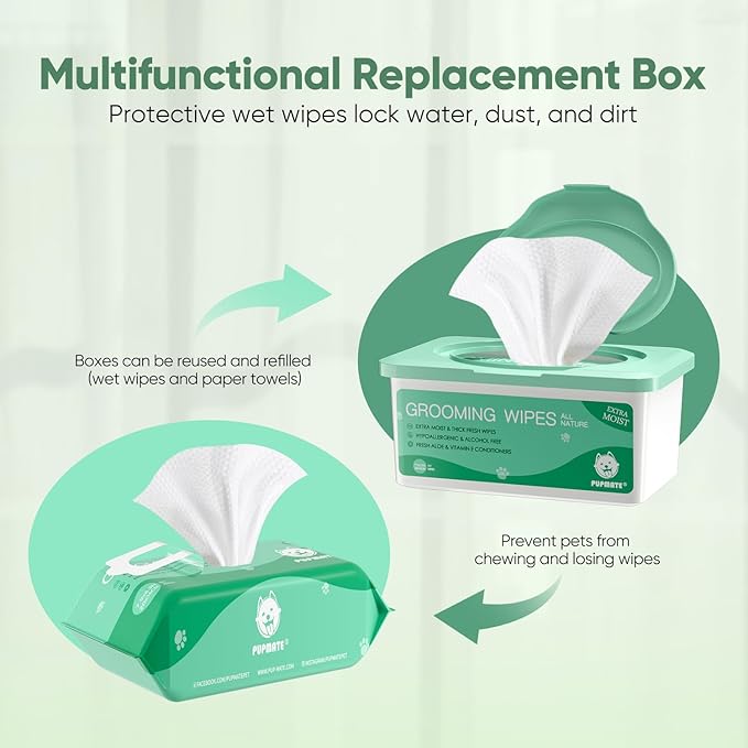 - DELICATE AND EFFICIENT CLEANSING: At PUPMATE, These grooming wipes for dogs & cats, and puppies wipes go beyond cleaning – they embody our commitment to creating a happier, healthier life for pets. Whether it's ridding them of dirt, mud, or a weird smell, our pet wipes work diligently to cleanse their butt, eyes, ears, and paws, ensuring that their four-legged friend feels consistently clean and delightfully refreshed