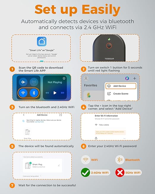 - Easy Set Up and Use: 2.4GHz Wi-Fi connection required. Before setup, ensure your Bluetooth is turned on and your phone is connected to 2.4GHz Wi-Fi (usually named "[Your Network]-2.4GHz"). Download "Smart Life" app and use it for initial configuration