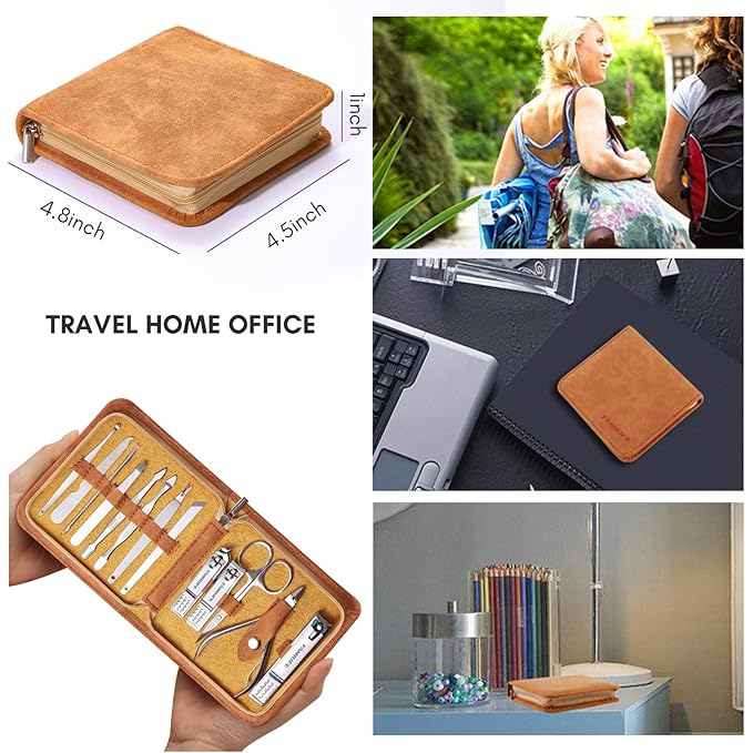 - Portable and Lightweight Manicure Pedicure Kit- FAMILIFE 13 in 1 professional nail clippers set comes with a brown portable PU leather case, the size is 4.5 * 4.8 *1 inch, 13 nail kit all come in a travel case for easy portability, suitable for many occasions, can fit in almost any handbag or shoulder bag, you can keep nail cleaning kit in your bag or take this eyebrow kit grooming with you on your travel, lightweight design , your perfect travel companion