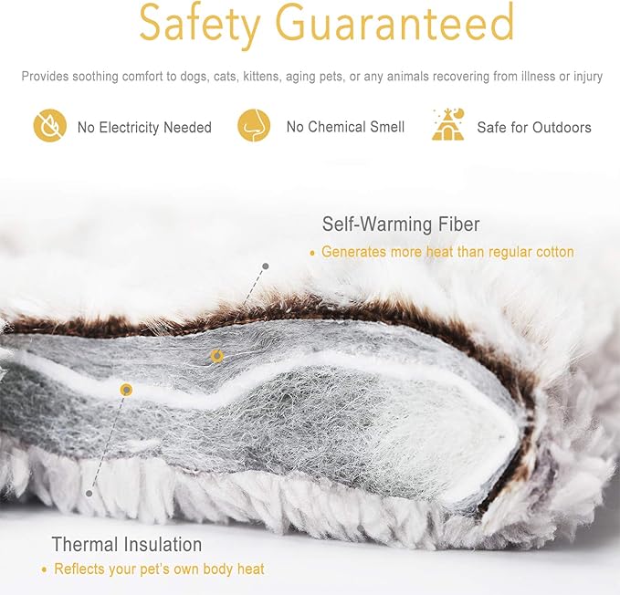 - Safety Guaranteed: No need to worry about any kind of safety hazard or chemical smell caused by using an electric pad! This self cat heating pad reflects and retains your pet’s own body heat to make them warm and comfy