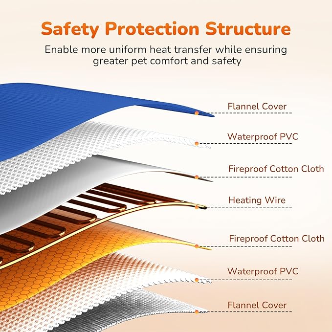 - SAFETY & SECURE STRUCTURE : MET Certified for peace of mind. The cat heating pad features an 8-layer protective structure with thickened soft PVC outer shells, built-in fire-resistant cotton materials, and fully sealed technology. It is equipped with waterproof, power leak-proof, and fire-resistant functions to protect your pets from burns.