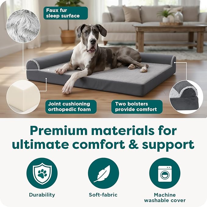 - EASY ON JOINTS: The dense and sturdy solid orthopedic foam base provides superior comfort and greater support for dog breeds of all sizes; fluff-filled bolsters support the neck, back, hips, and joints to help ease discomfort and promote restful sleep