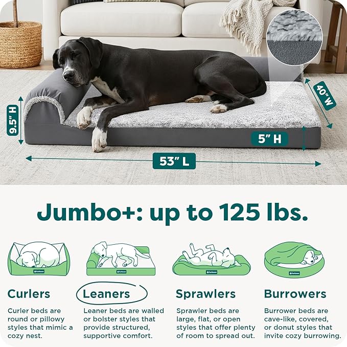 - PRODUCT DETAILS: Orthopedic Dog Bed, Stone Gray; Jumbo Plus - 53" x 40" x 9.5" (5" Base Foam Height; Sleep Surface: Approx. 47" x 34")