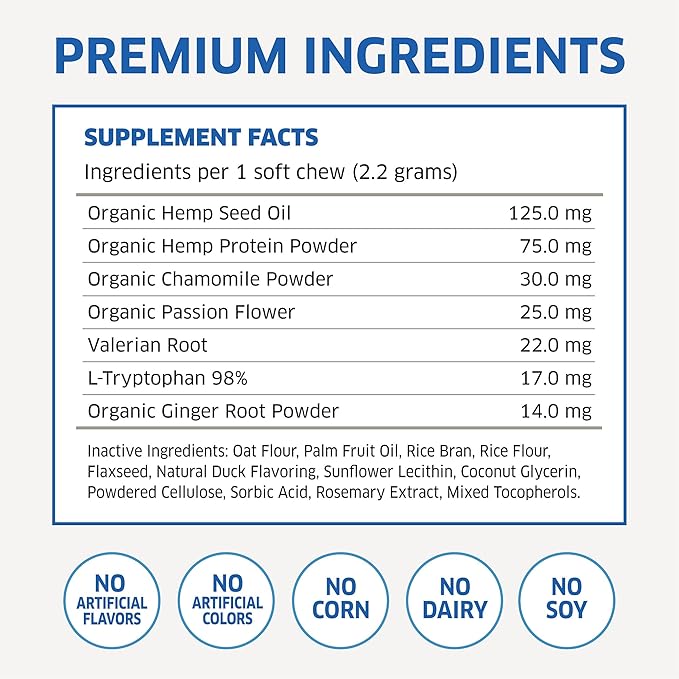 - PREMIUM CALMING AID FORMULA - Our calming chews for dogs have Passionflower, Valerian root, and L-Tryptophan; these natural soothing ingredients help promote a sense of calm and relaxation in your dog.
