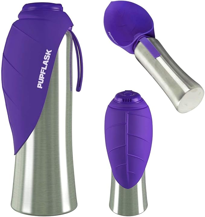 - HAPPY, HYDRATED PETS make the best traveling companions, and the PupFlask goes wherever you and your furry friend venture. Reversible leaf-shaped bowl lays flat over bottle when not in use.