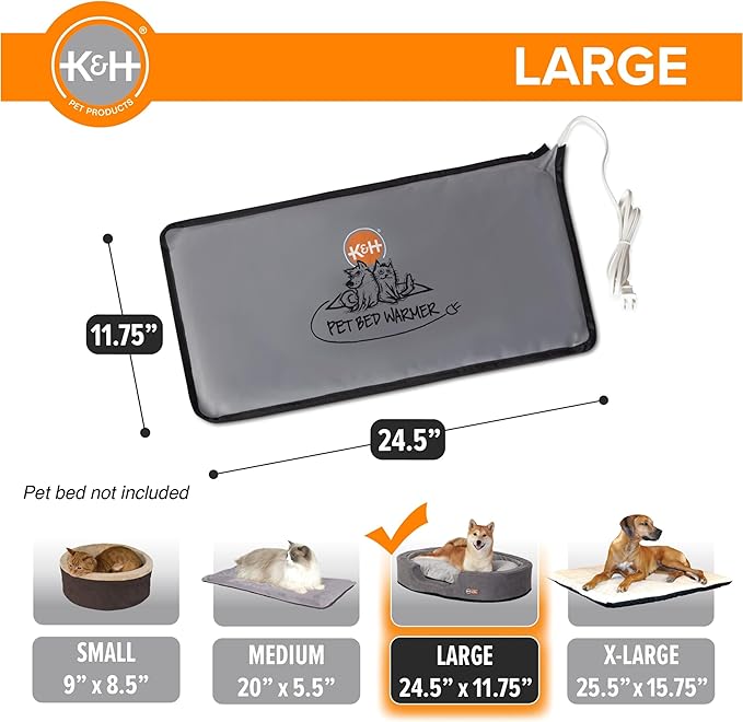 - LARGE SIZE: The Large Pet Bed Warmer measures 11¾" x 24½", uses only 13 watts of power, and should always be used inside a pet bed; large size is recommended for beds from 25-50in long - place in center of bed to warm your pet's core