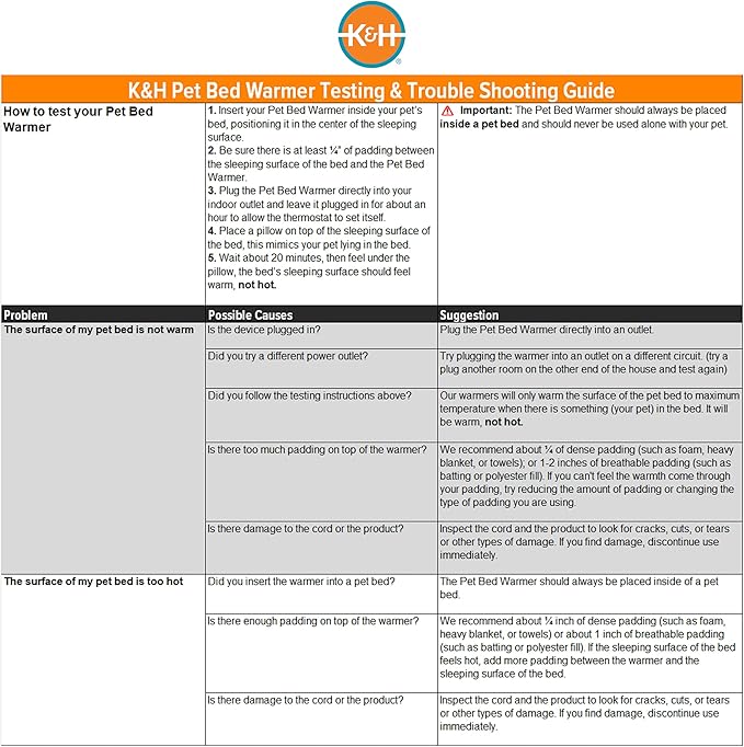 - IMPORTANT: ALWAYS place inside a pet bed; It is recommended to have a minimum of ¼ inch of padding between your pet and the warmer; if your padding is too thick or not breathable (such as towels / heavy blankets), the bed surface may not get warm