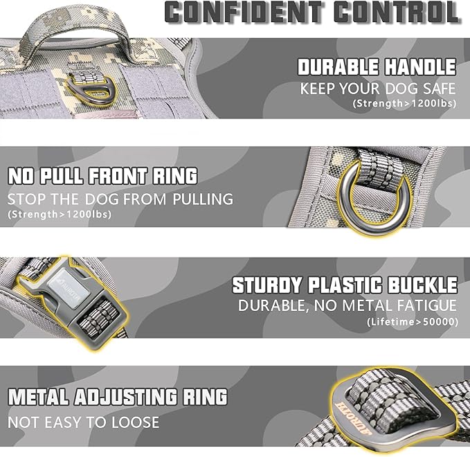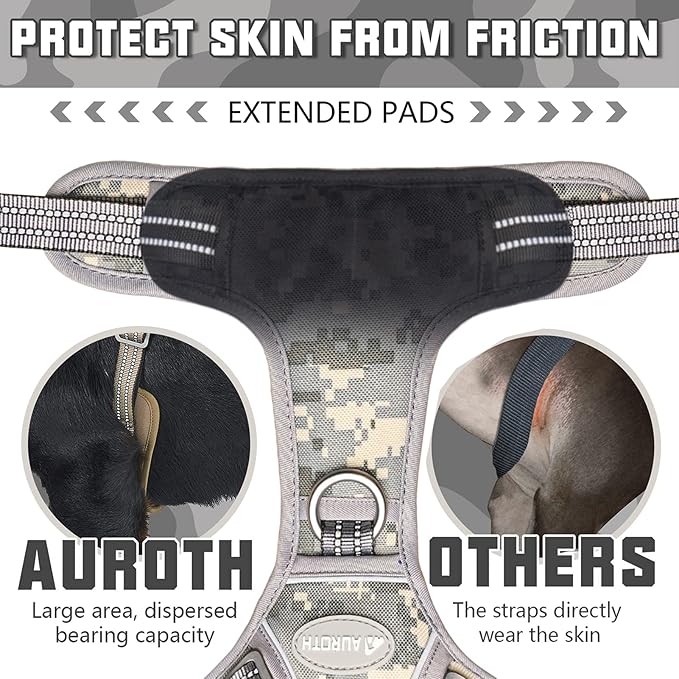 Auroth Tactical Dog Harness for Small Medium Large Dogs No Pull Adjustable Pet Harness Reflective K9 Working Training Easy Control Pet Vest Military Service Dog Harnesses XL Grey Camo