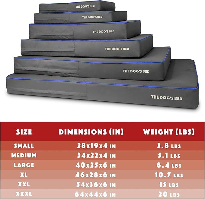 - Amazon's LARGEST DOG BED - XXXL Grey with Dark Blue Trim (Easy Clean Cover) 64x44x6” waterproof orthopedic dog bed. Solid 2” high density, orthopedic memory foam over a solid 4” base of high stability support foam with covers designed so that your bed fits your home decor seamlessly and your dog can stay close to your family