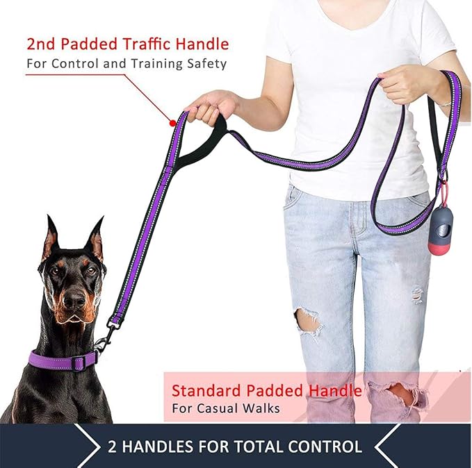 JSXD Heavy Duty Double Handle Dog Leash - 5 FT with Comfortable Padded and Reflective Rope, for Small to Large Dogs (Wide-Purple)