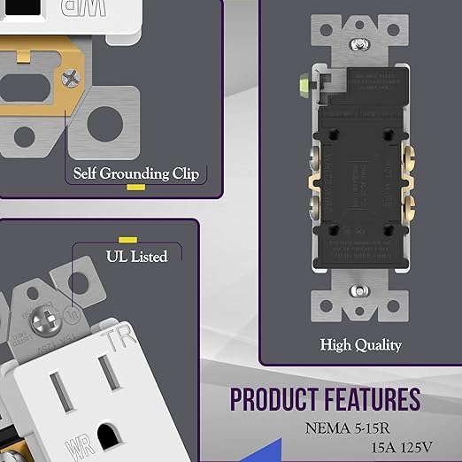 - 15A 125VAC, 5-15R; 2-pole; 3-wire; flammability UL94, V2 Rating; UL Listed; 1-year warranty; wall plate sold separately