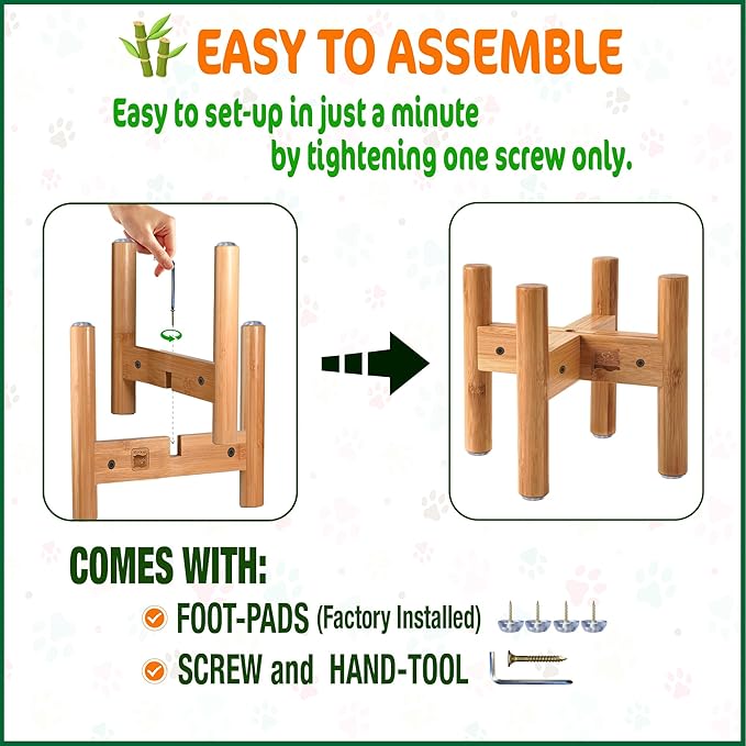 - Quick and Easy Assembly – This dog food feeder bowl stand sets up in just a minute using the included screws and hand tool. Rubber foot pads are already pre-installed. It keeps the dog bowl stand firmly in place, protecting floors from scratches and stopping any unwanted movement. Everything you need is included for a quick setup experience, so your pet can enjoy their new raised dog feeder bowl right away.