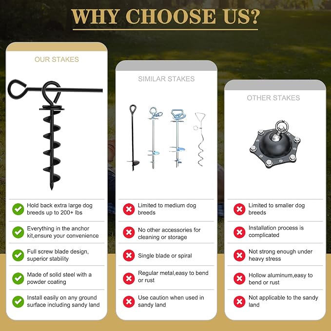 - GIVE IT AS A GIFT! Every package includes: gravity dog tie out stake + Easy-lever Installation tool + cleaning brush + leash clip + portable carrying bag. With this dog anchor, you give the gift of safety and peace of mind to pet owners.