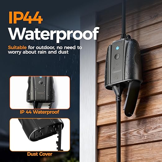 - Two Individual Outlets: Comes with 2 AC sockets that can be controlled independently or simultaneously; 125V, 15A, 1875W, 2HP each and total; With IP44 waterproof, the rubber socket covers to help prevent rain from getting in, withstands damp, wet, snow and cold conditions; TESSAN smart plug can be used indoors and outdoors to meet the needs of various occasions like swimming pool, garden, patio, office, kitchen