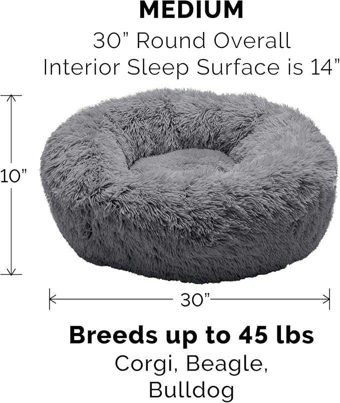Furhaven 30" Round Calming Donut Dog Bed for Medium/Small Dogs, Refillable w/ Removable Washable Cover, For Dogs Up to 45 lbs - Shaggy Plush Long Faux Fur Donut Bed - Gray, Medium