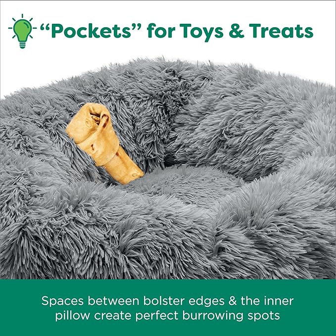 Furhaven 23" Round Calming Donut Dog Bed for Indoor Cats & Small Dogs, Washable, For Dogs Up to 20 lbs - Shaggy Plush Long Faux Fur Donut Bed - Gray, Small, 23.0"L x 23.0"W x 9.0"Th