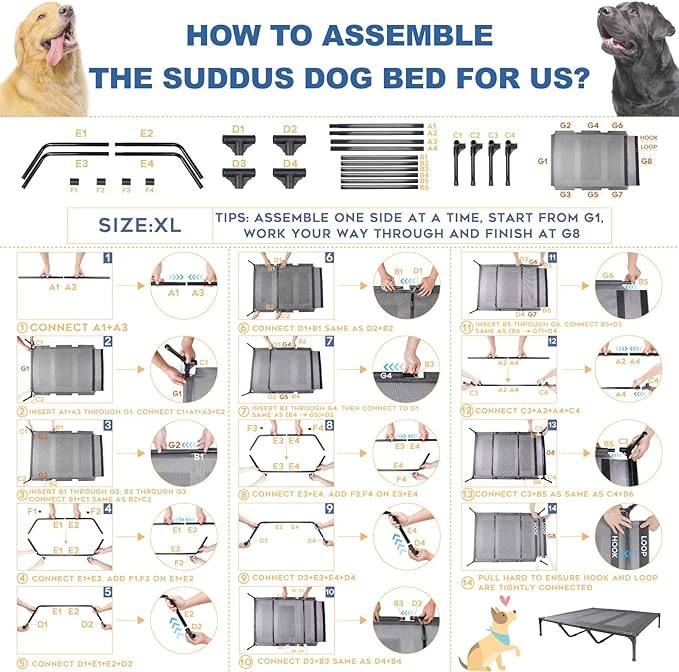 - [Excellent After-sale Service] Designed with non-slip rubber pads and anti-skid plastic accessories, the SUDDUS elevated dog bed offers protection in every way. Enjoy a 24-hour online service and 12-month warranty, including free replacement of plastic parts and replacement covers within one year.