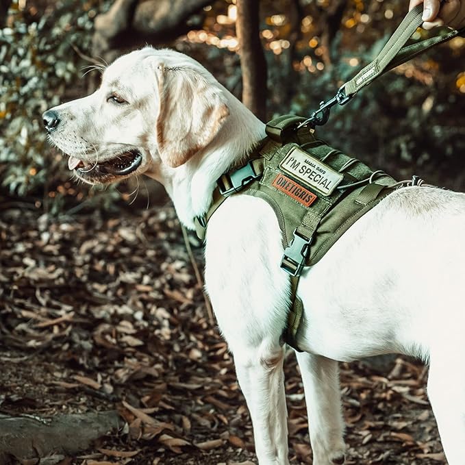 - MOLLE System & Military Style: Each side features two MOLLE straps as well as hoop & loop strips panel to easily attach molle pouches or ID panels; OneTigris harness is not designed to bear heavy weights and we advise against relying solely on the grab handle to carry your dog