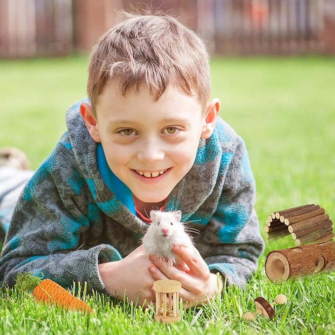 - 【Natural&Safe】Our hamster toys are made of 100% natural wood, safe and durable for chewing and biting. Let your pets to have a lot of fun in their own place. Natural and handmade rodent toys for your pets.