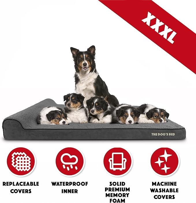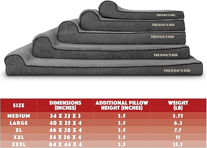 - Amazon's LARGEST DOG BED - XXXL Grey Plush 64” x 44” x 4” (+3.5" Headrest) waterproof orthopedic headrest dog bed. Solid 2” high density, orthopedic memory foam over a solid 2” base of high stability support foam with covers designed so that your bed fits your home decor seamlessly and your dog can stay close to your family
