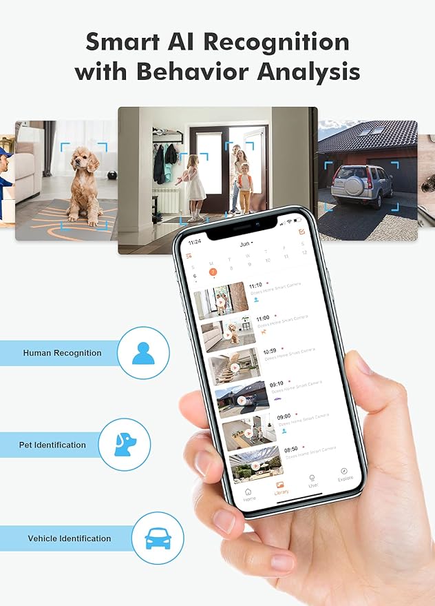 - [Advanced AI Human Pet Vehicle Recognition & PIR Motion Detection] With AI technology, this outdoor security cameras wireless analyzes and distinguishes humans, pets, and vehicles based on the monitoring target you set in Dzees Home App. Data is processed via AI, resulting in faster decision-making and fewer external errors. The end result is more accurate detection and fewer false alerts.
