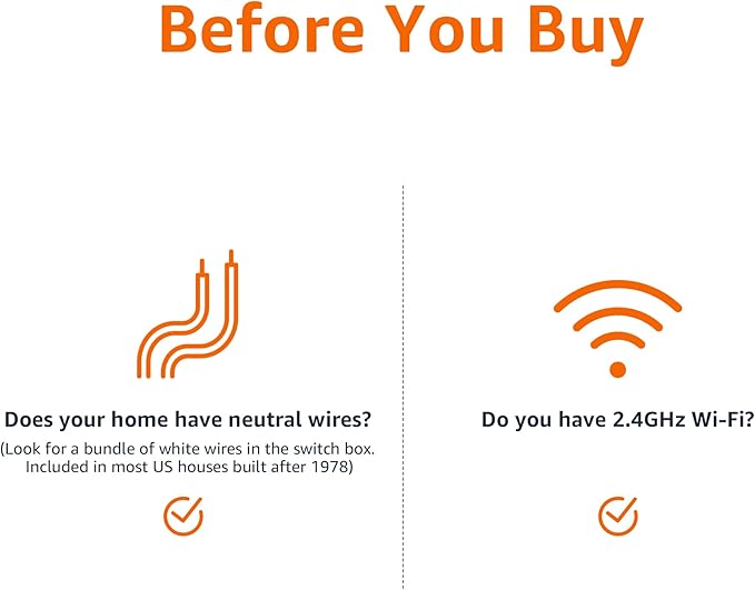 - SETUP REQUIREMENTS: Neutral wires required, 2.4 GHz Wi-Fi