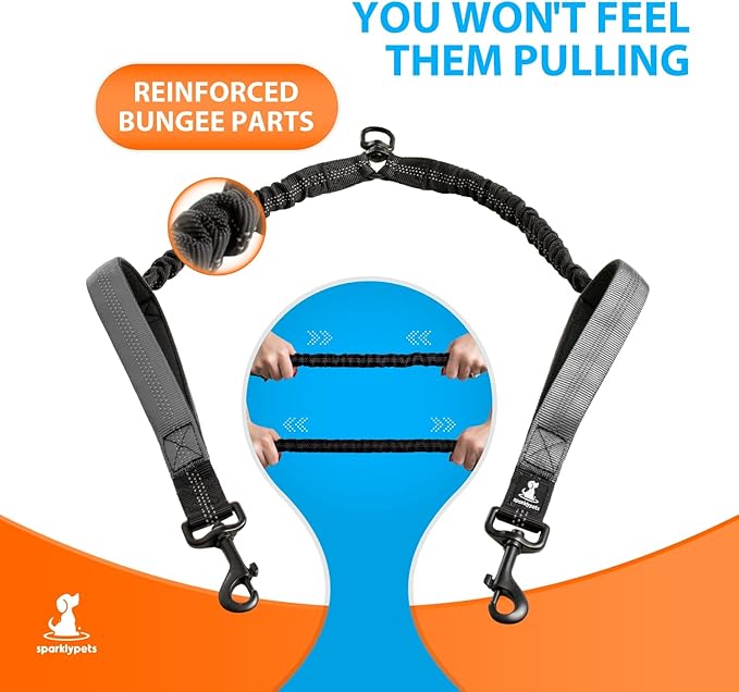 - You won’t feel them pulling the double leash - If you have large dogs you need a two dog leash that’s shock-absorbing. This leash for two dogs comes with strong and flexible bungees that prevent waist and back injuries from medium or large pullers. Our walking leash for dogs that pull will be the perfect no pull dog leash for large and medium dogs.