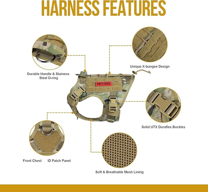 - MOLLE System & Military Style: Each side features two MOLLE straps as well as hoop & loop strips panel to easily attach molle pouches or ID panels; OneTigris harness is not designed to bear heavy weights and we advise against relying solely on the grab handle to carry your dog