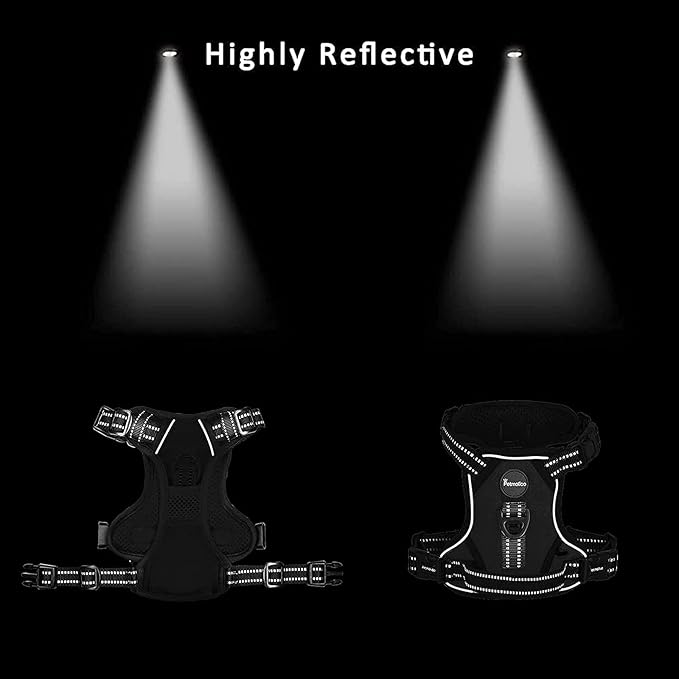 - [ Adjustable, Safe and Comfortable ] The padded areas on the back and chest are very comfortable. It is mesh-lined so that can be wear both winter and summer. It features 4 easy adjusting straps, you can use 2 neck straps and 2 chest straps to create a perfect fit for your dog with some room of growth. It fits well enough to not slip around when your dog is walking, trotting or running. With reflective material which makes finding a your pup in the dark very easy even without a flashlight!