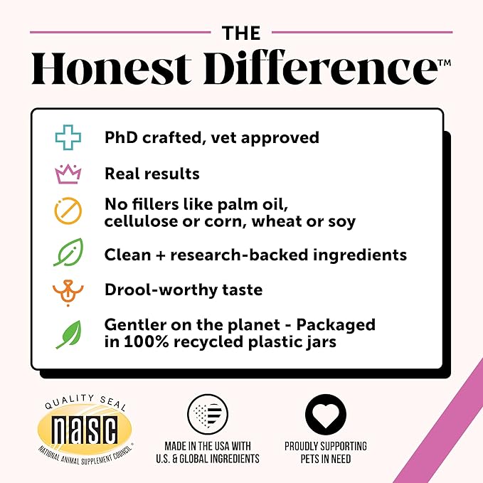 - Manufactured in the U.S.A. | NASC member company: All Pet Honesty products are made in the US with US and globally sourced ingredients and are produced in a GMP-compliant facility that meets the highest safety standards so you can rest assured you're giving your pet the best quality product possible! Pet Honesty is also a NASC member company meaning it’s met the highest quality and compliance standards for pet supplements.