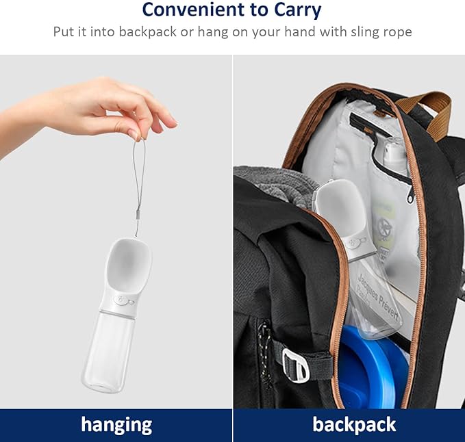 - [Convenient to Carry]: Enough capacity and compact water bottle design is great for your pet dog or cat when outdoor walking, running, hiking, traveling or playing, etc. You can put it into backpack or hang on your hand with sling rope, very easy to carry to anywhere you want.