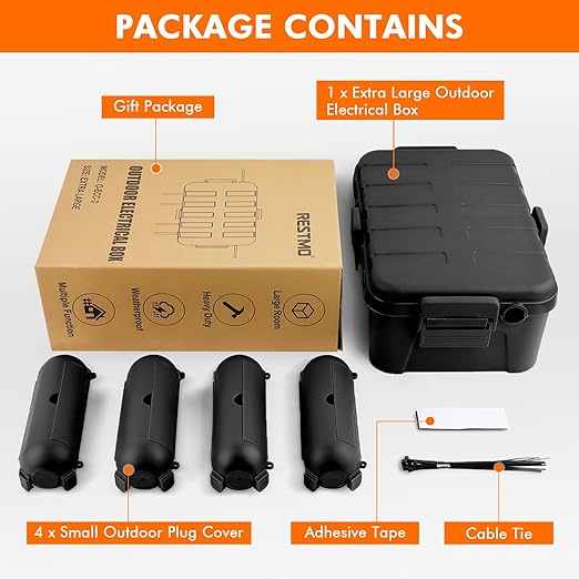 - ONE FOR ALL: The package includes 1 extra-large outdoor electrical box, 4 small outdoor plug cover, 10 cable tie and 1 adhesive tape. Buy this holiday selection bundle to protect all of your holiday lighting decorations.