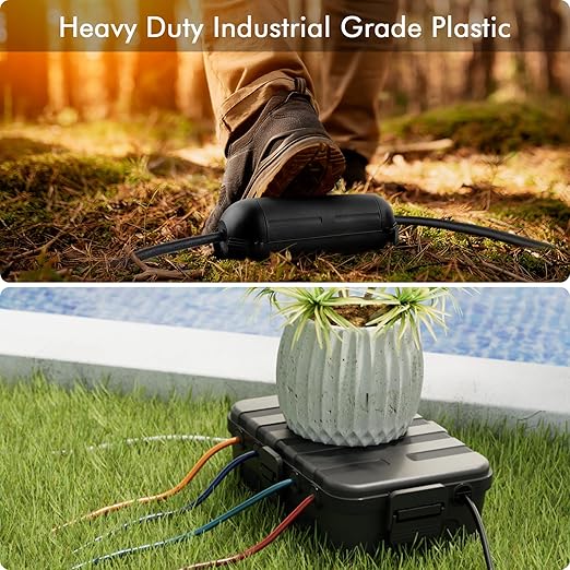 - HEAVY DUTY & WEATHERPROOF: Constructed with industrial grade material, highly durable and UV resistant, great to use in outdoor harsh environment and resist water, snow, rain, dust, dirt. Ideal to protect outdoor extension cord, LED string light, landscape lighting, pool pump, garden power tool, fountain, Christmas and other holiday decorations.