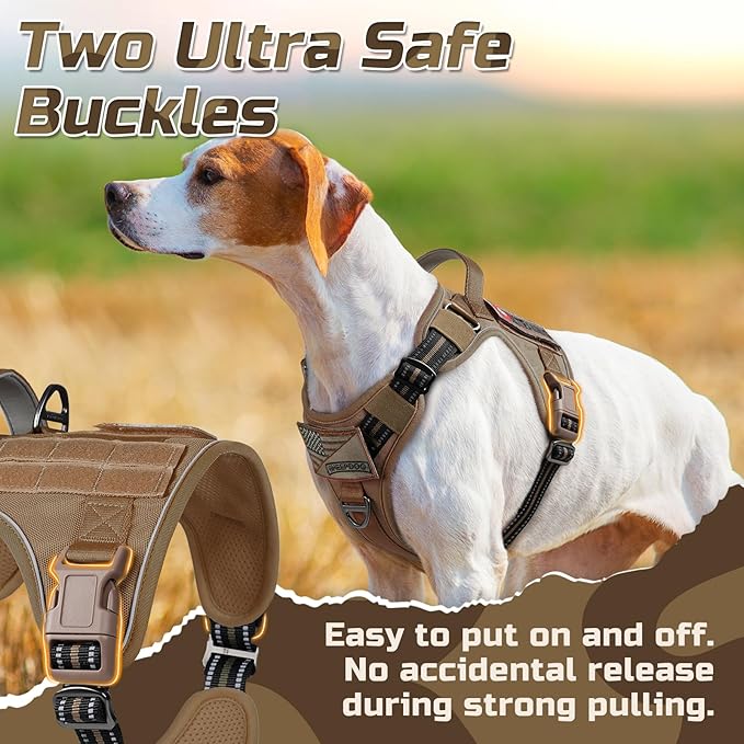- Easy to Adjust & Wear: The tactical dog harness features 4 convenient adjustment points (2 Shoulder, 2 Chest) to ensure a snug fit for dogs of all sizes. Two quick-release buckles are designed not only for easy on and off, but also can withstand great pulling force, providing security for training, hunting, walking, and any other occasions