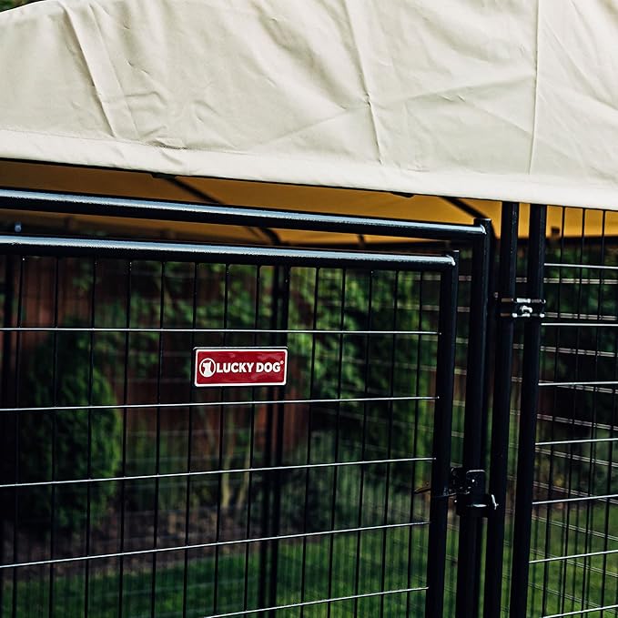 Lucky Dog Stay Series 8' x 8' x 6' Executive Black Powder Coat Steel Frame Large Outdoor Dog Kennel w/Waterproof Canopy Roof & Single Gate Door, Khaki