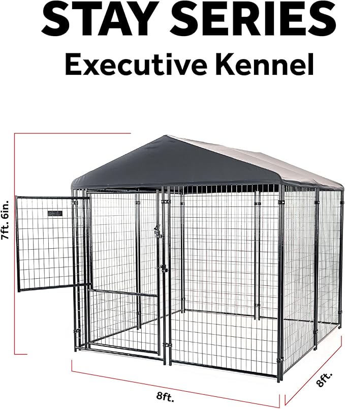 - CONVENIENT ASSEMBLY: Executive dog kennel features a straightforward, no tool assembly; Includes frame, roof, gate door, canopy cover, and hardware