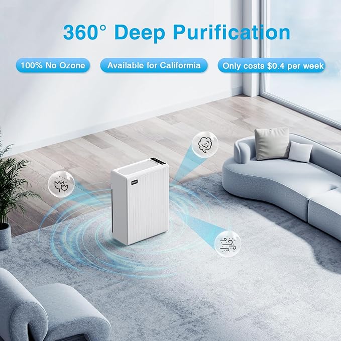 - Advanced 3 STAGES FILTRATION SYSTEM: Equipped with a pre-filter for large particles like lint and fur, an H13 True HEPA filter which captures nearly all airborne particles 0.3 microns in size, ridding your environment of dust, pollen, pet dander and a high-efficiency activated carbon filter for toxic fumes and unpleasant odors. This home air purifier is 100% Non-Ozone, never uses UV-C light, which the research has shown can produce harmful ozone and secondary pollution.