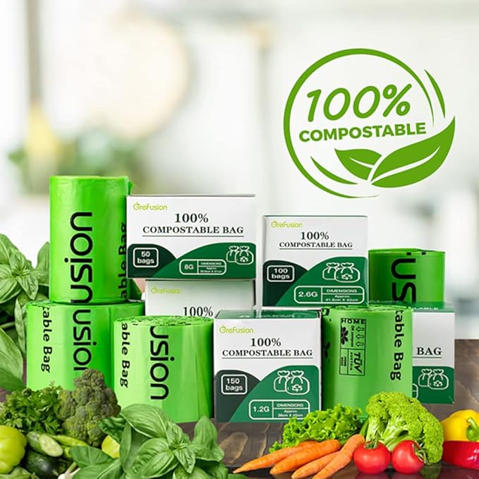 - 【ECO FRIENDLY TRASH BAGS &COMPOSTABLE】These compostable garbage bags are made from corn starch, that break down in compost bin or local green waste collection,worm farms,soils. The green trash bags feed the micro-organisms in the soil when composted,which benefits the Earth and its surroundings. Replace harmful plastic kitchen trash bags with our green compostable trash bags to reduce environmental waste and create a brighter future together