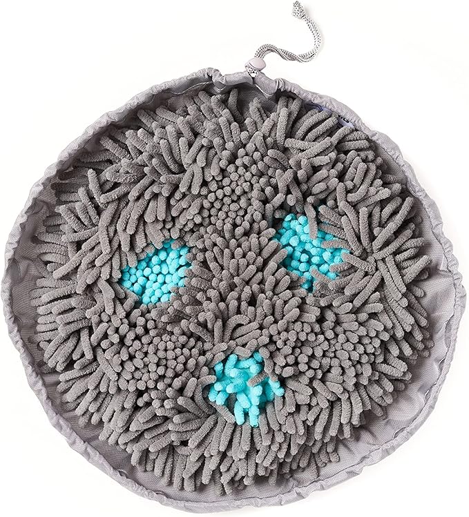 - TRAVEL FRIENDLY - Whether you are traveling across the country or heading across town to family or friends, these dog puzzle toys are great for every traveling furbaby. The drawstring pocket cinches up for travel, difficulty adjustment, and you can put the drawstring into the pocket to dissuade chewing and choking. This pet snuffle mat has a durable, but soft material that helps ensure no injuries occur while sniffing and digging for their food on the road.