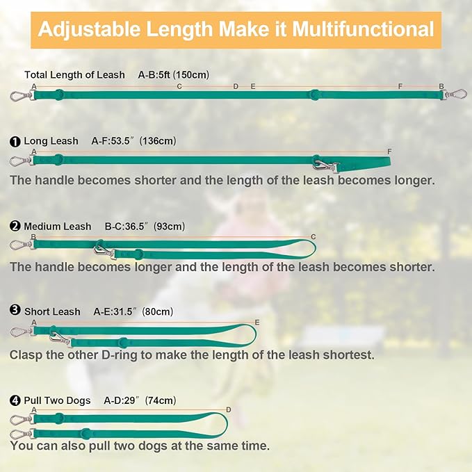 Wisedog Waterproof Dog Leash – 5ft/6ft Adjustable with 2 Metal Swivel Hooks, Easy to Clean Dog Leashes for Small, Medium, Large Breed Dogs (Emerald Green,M)