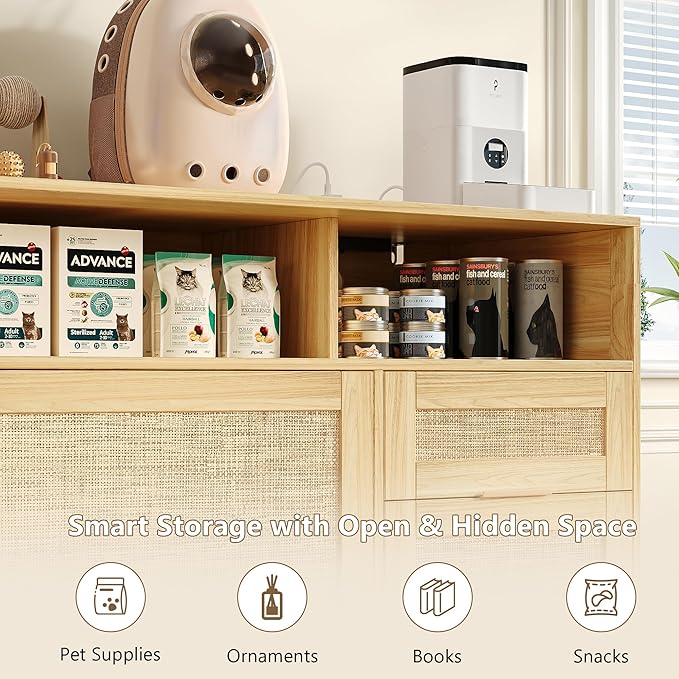 - For Cats, Also for You: This boho-rustic hidden litter box furniture showcases a realistic rattan design, blending style with practicality. Use it as a litter box enclosure to hide clutter, or add a cat bed inside for a cozy napping spot, or repurpose it as a storage cabinet for your daily needs—its versatility works for both of you
