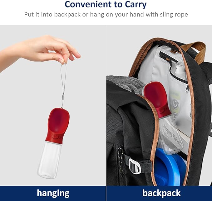 - [Convenient to Carry]: Enough capacity and compact water bottle design is great for your pet dog or cat when outdoor walking, running, hiking, traveling or playing, etc. You can put it into backpack or hang on your hand with sling rope, very easy to carry to anywhere you want.