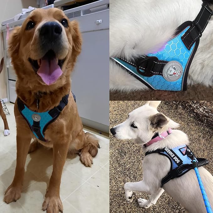- 【3M Reflective Straps & Sturdy Handle】Reflective straps on the dog vest and dog leash ensure your dog is highly visible and keep dogs safe at night. You can connect the dog leash on the D-ring and it is safer on crowded streets.The high-end harness is perfect for daily walking, running, hiking, training, hunting, outdoor adventure and more.Dog harness with sturdy rubber handle on the back helps you better control and assist your dog.